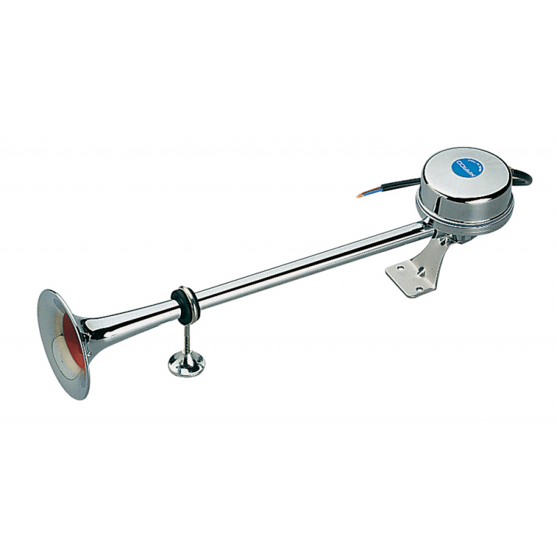 Tromba elettromagnetica con cornettoin acciaio inox. Nota greve di notevole intensità acustica, udibilità inmare a mt. 1.300, livello sonoro 118 dB, 370 Hz. Lung. mm. 400.
