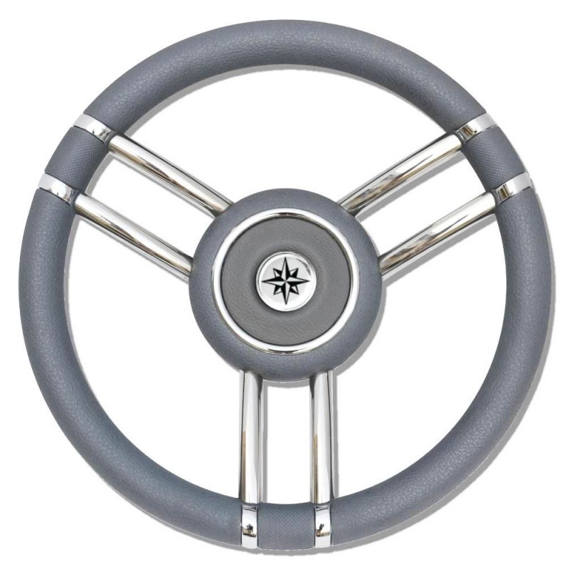Volante a 6 razze Ø mm.16 curve in acciaio inox lucidato a specchio. Mozzo e coperchio in alluminio ricoperto di poliuretano con logo rosa dei venti al centro. Impugnatura in poliuretano morbido. Inclinazione 7°. Cono universale