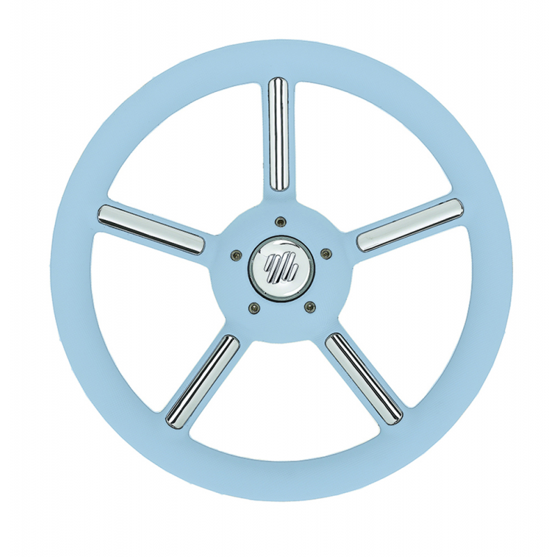 Volante V56 a 5 razze con impugnatura in morbibo poliuretano e razze con inserti in acciaio inox. Cono universale