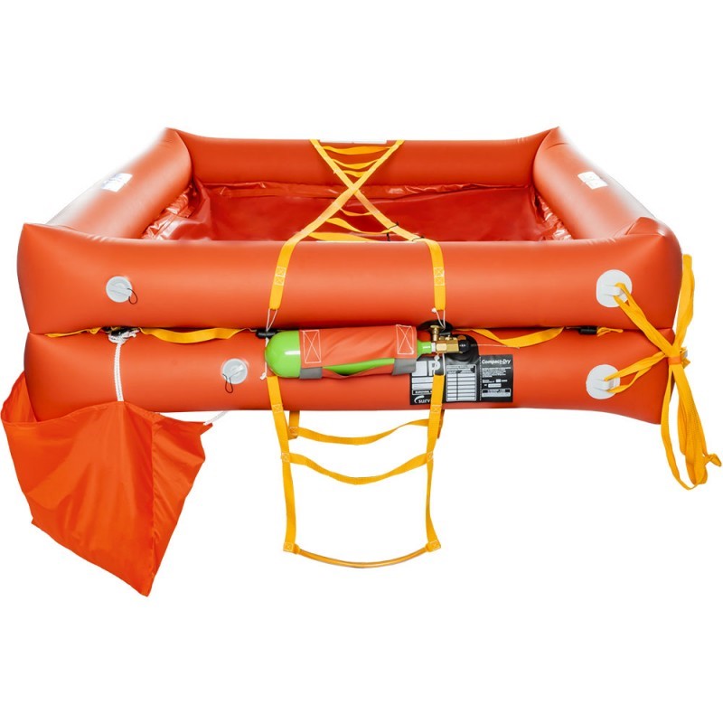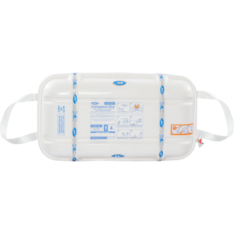 Zattera Compact-dry Plus contenitore rigido in vetroresina, mezzo di salvataggio per la navigazione entro le 12 miglia dalla costa, omologato in conformità a quanto indicato nel decreto dirigenziale emanato dal Comandante Generale del corpo delle capitanerie di porto, in data 2 Marzo 2009, secondo quanto previsto dall’art 54 del decreto ministeriale n° 165 del 28 Luglio 2008.Prima revisione dopo 3 anni, successive ogni 2 anni. Dim. cm. 74x41x24h, peso kg. 30